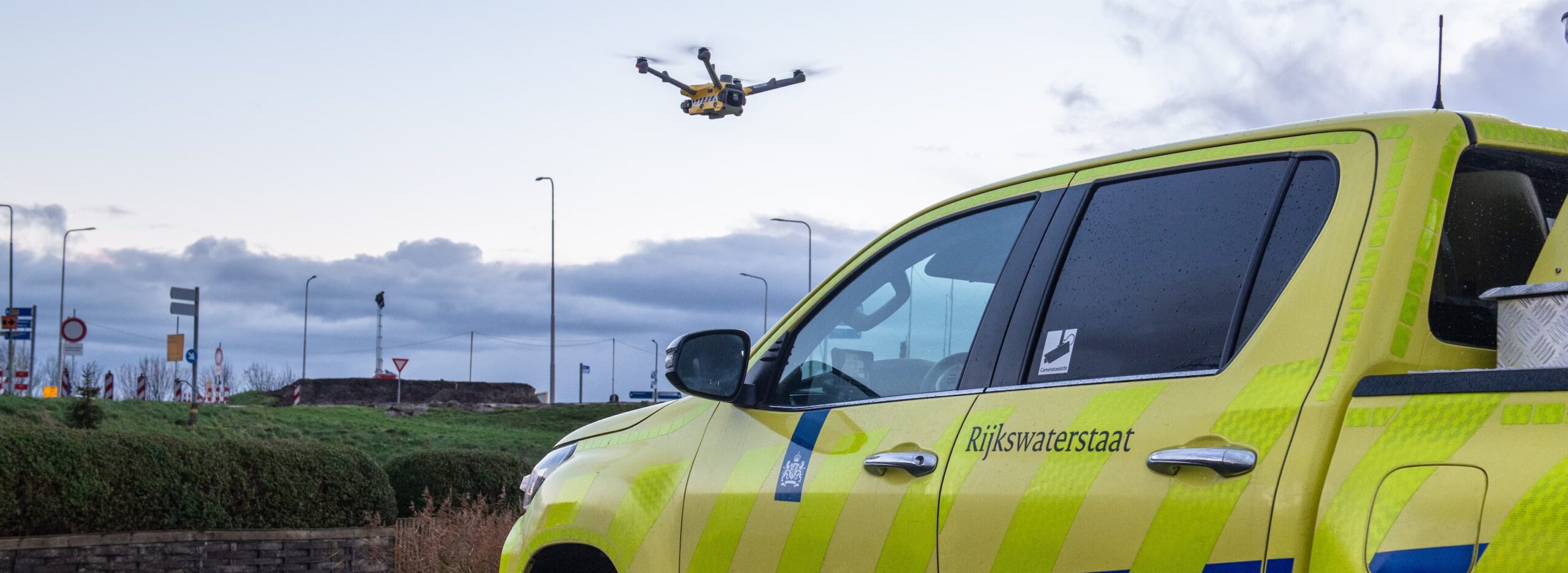 De drone in Den Helder is te herkennen aan de geel-blauwe kleuren van Rijkswaterstaat